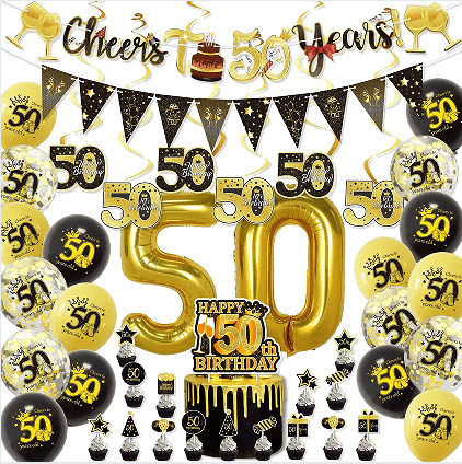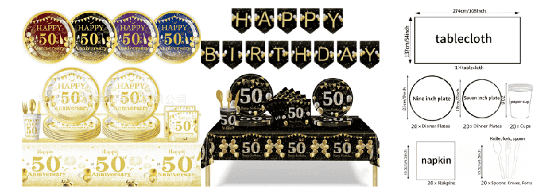 पेपर बर्थडे टपर: केक सजावटको मुख्य वस्तुको रूपमा, मुख्य कार्डले कोरको रूपमा "ह्याप्पी बर्थडे टु 50 वर्ष" शब्दहरू लिन्छ, र आतिशबाजी, ताराहरू, जन्मदिन टोपी र अन्य आकारहरूसँग मुख्य केक सजावटसँग मेल खान्छ। राउन्ड "50" को समर्थन गर्दै, शुभ क्लाउडहरू, मुकुट र अन्य मिनी कार्डहरू, बाक्लो कार्डबोर्डबाट बनेको र ठोस बाँसको स्टिकहरूसँग मिलाइएको, उत्कृष्ट विवरणहरू सहित, कपकेक र डेजर्ट टेबलहरूले सजाउन सकिन्छ।