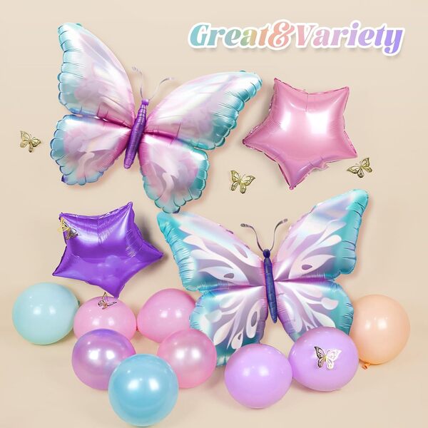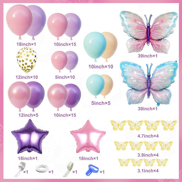 बटरफ्लाइ बेलुन माला किटमा मुख्यतया लेटेक्स बेलुनहरू समावेश हुन्छन्, तिनीहरू विभिन्न आकारहरूमा आउँछन् (5 इन्च, 10 इन्च, 12 इन्च र 18 इन्च)। तिनीहरूको रंगहरू सामान्यतया गुलाबी, नीलो, बैजनी, इत्यादिले हावी हुन्छन्। किटको लेयरिङ प्रभाव बढाउनको लागि, तपाईंले पारदर्शी लेटेक्स बेलुनहरू र कन्फेटी लेटेक्स बेलुनहरू पनि हेर्न सक्नुहुन्छ। किटको विषयवस्तुको रूपमा, बटरफ्लाइ पन्नी बेलुनहरू पनि अपरिहार्य छन्। तिनीहरूका अधिकांश रङहरू उज्यालो छन् (नीलो/गुलाबी/बैजनी...), र औसत आकार 18-30 इन्च हो (अनुकूल आकारहरू उपलब्ध छन्)। थप रूपमा, तिनीहरूसँग धेरै यथार्थवादी उपस्थिति छ जुन लगभग जीवन जस्तो छ।
