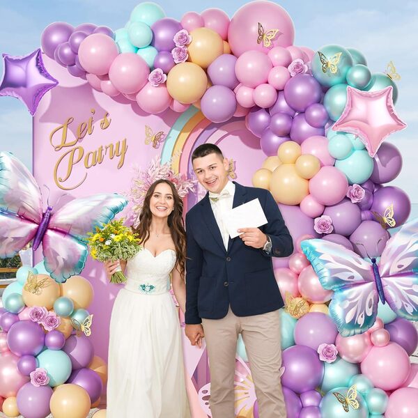 बटरफ्लाइ बेलुन आर्क किट: आर्क किट रंगीन र आकर्षक छ, यो विभिन्न पन्नी बेलुन र लेटेक्स बेलुनहरू मिलेर बनेको छ। यसलाई व्यवस्थित गर्दा, ढाँचा र फरक पाठको साथ पृष्ठभूमि बोर्ड थप्नुहोस्, र त्यसपछि यसको वरिपरि बेलुनहरू घेर्नुहोस्। यो घटना मा वातावरण को निर्माता हो। यसको अगाडि फोटो खिच्दा धेरै सुन्दर देखिन्छ।