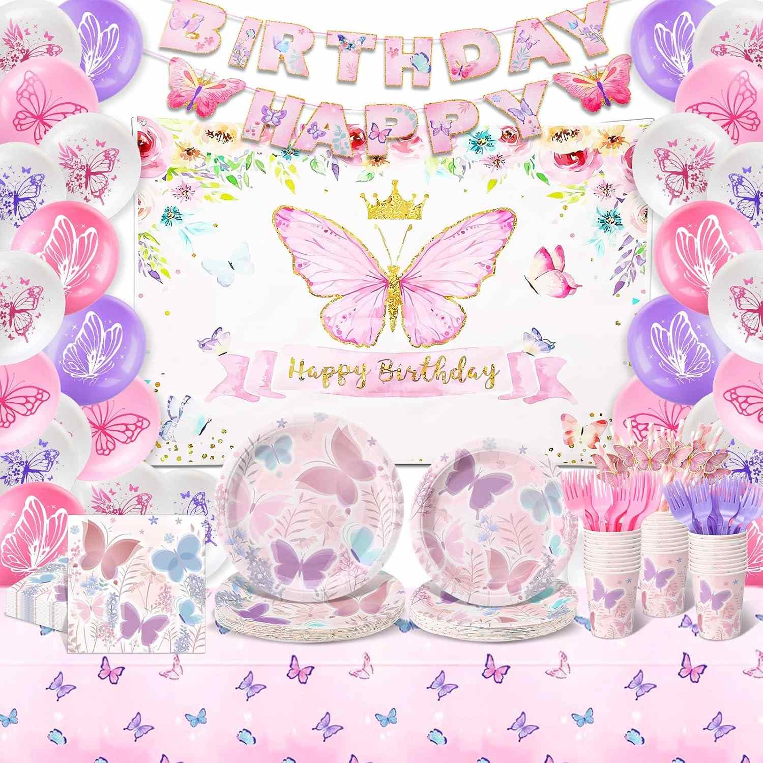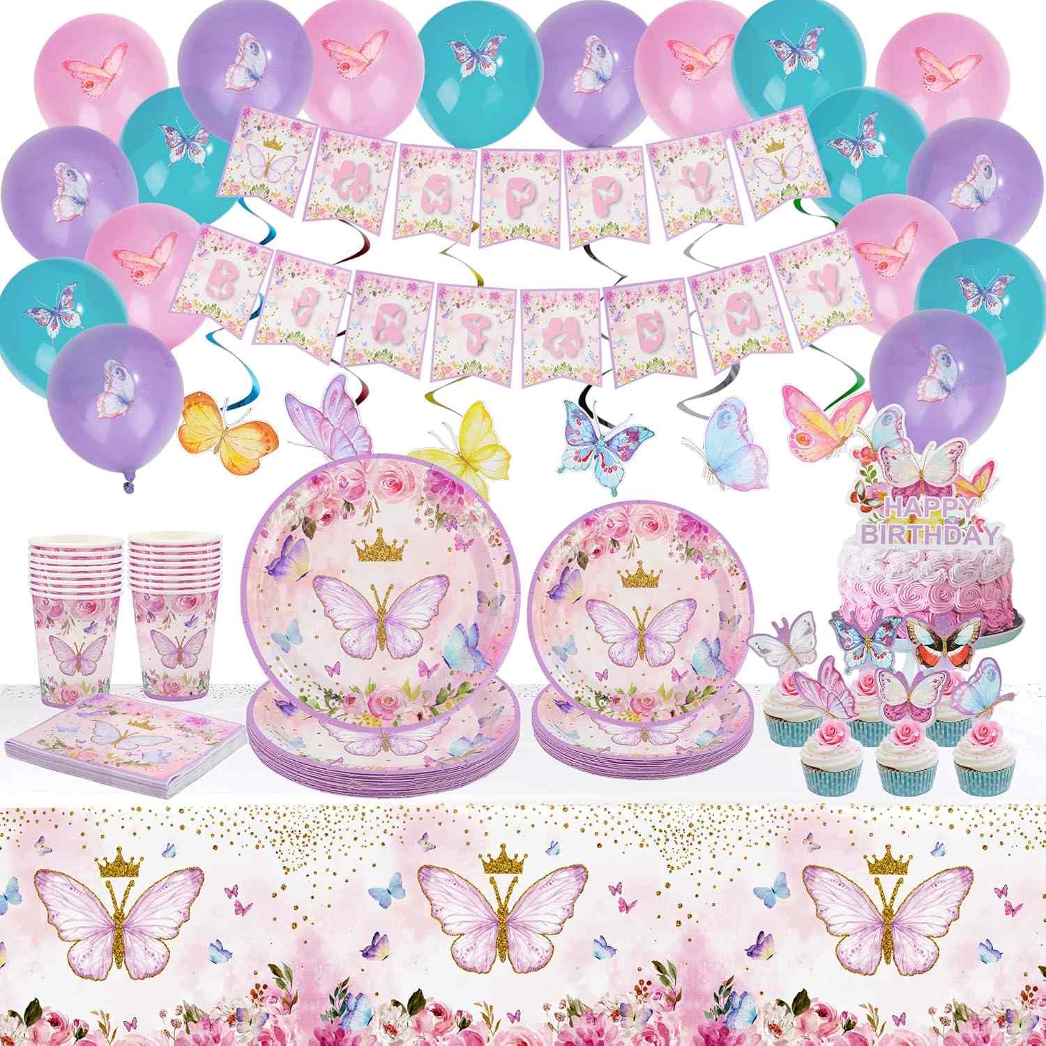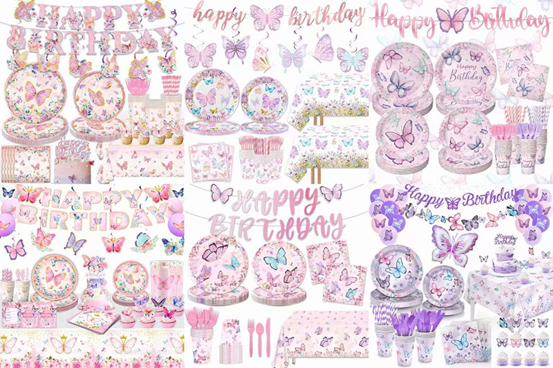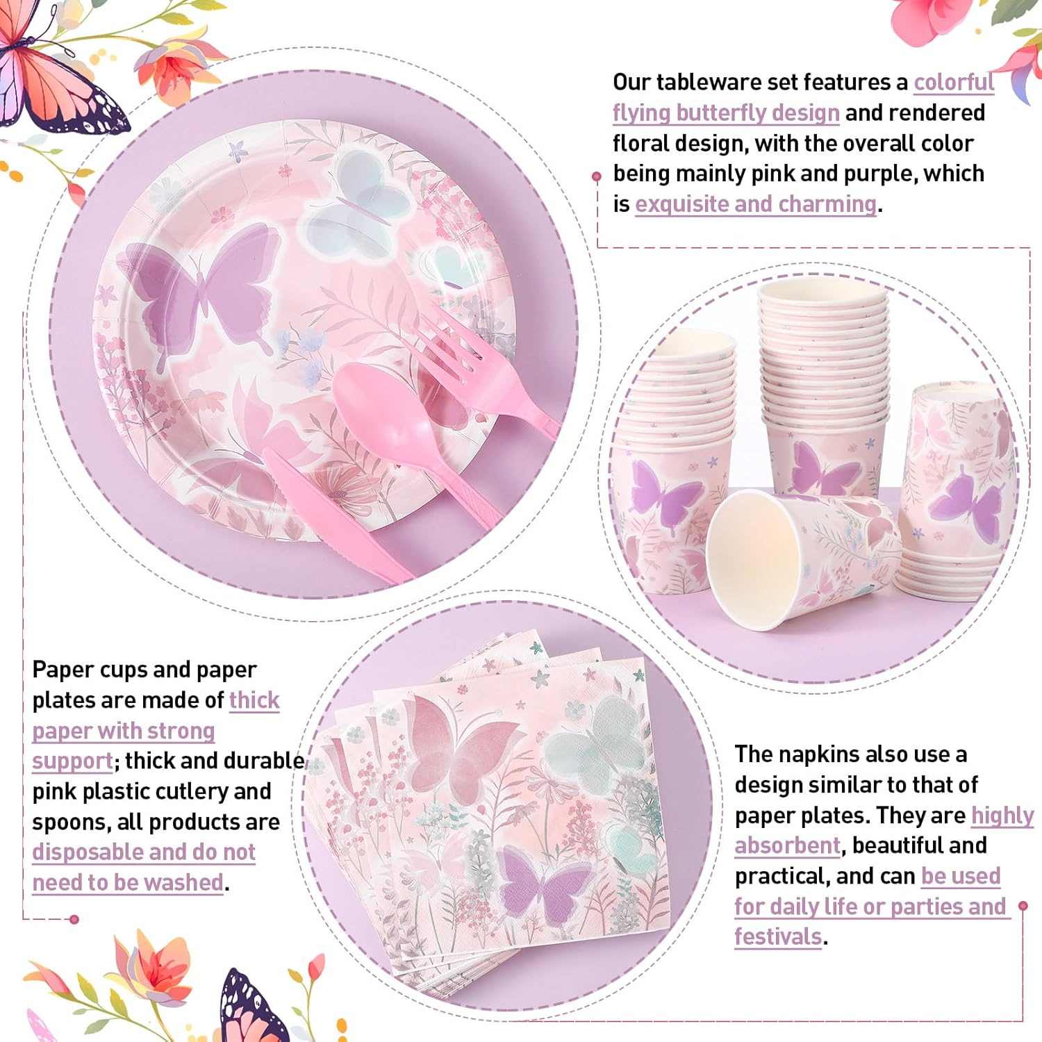 पार्टी सजावटको लागि उत्कृष्ट विकल्प बटरफ्लाइ पार्टी टेबलवेयर सेट हो। नेपकिन, पेपर प्लेट, पेपर कप, फोर्क र चक्कुहरू समावेश छन्। प्रत्येक टुक्राले पुतलीका भागहरू देखाउँछ।