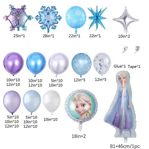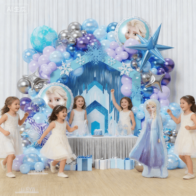 फ्रोजन थिमयुक्त बेलुन आर्क डिज्नी शैली उत्पादनको रूपमा सेट गरिएको छ, संसारका बालबालिका र वयस्कहरूले मन पराएका छन्।