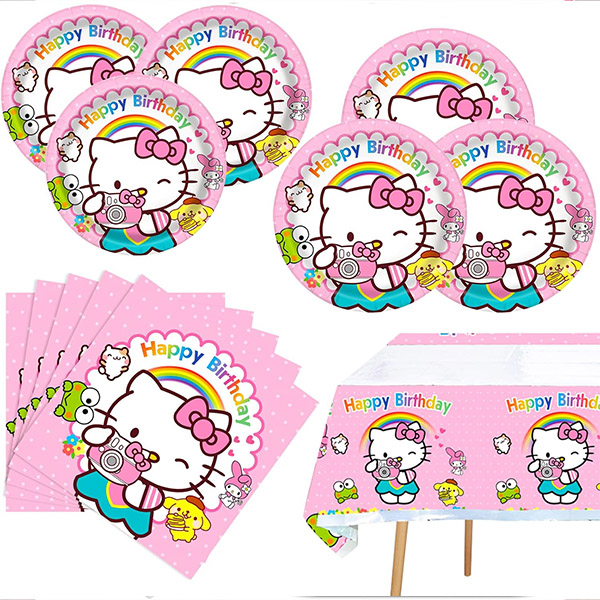 3) टेबलवेयर: हेलो किट्टी टेबलवेयर अझै पनि तपाईंको पार्टीको लागि एक प्यारा वातावरण सिर्जना गर्न सेट गरिएको गुलाबी र सेतो पार्टी आपूर्तिहरूको अद्वितीय ढाँचाका डिजाइनहरूसँग जोड्न सकिन्छ। सबै उत्पादनहरू धेरै टिकाउ, चम्किलो रङका छन्, र उच्च गुणस्तरको अनुभव छ।