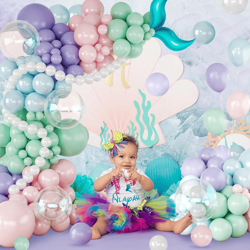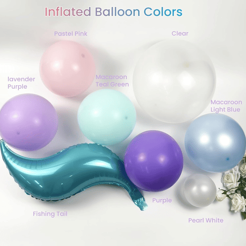 मरमेड बेलुन मालामा भएका बेलुनहरू बैजनी, ल्याभेन्डर, पेस्टल गुलाबी, हल्का नीलो, टिल हरियो, पर्ल सेतो र पारदर्शी जस्ता बहु रङहरूका साथमा फोइल मरमेड टेलको सजावटका साथ आउँछन्, यसले जादुई मत्स्यांगना महासागर थिम पार्टी सिर्जना गर्न उत्कृष्ट बनाउँछ।