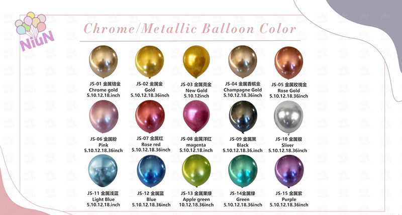 हामी हाम्रो धातु बेलुनहरूको लागि आयातित मसी कोटिंग प्रविधि प्रयोग गर्छौं। रंगहरू समान र धनी छन्। उदाहरणका रूपमा चित्रहरूमा भएकाहरूलाई लिनुहोस्। तिनीहरू धातु शैम्पेन सुन, धातु निलो र धातु बैजनी समावेश छन्। यी रंगहरू युरोपेली र अमेरिकी बजारहरूमा लोकप्रिय साबित भएका छन्। तिनीहरू धेरै अवसरहरूमा फिट हुन्छन्। यी अवसरहरू विवाह, जन्मदिन र वार्षिकोत्सवहरू हुन्।